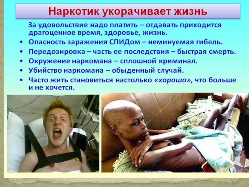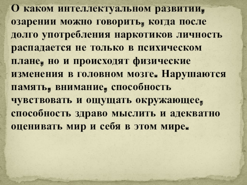 Слайд 28О каком интеллектуальном развитии, озарении можно говорить, когда после долго употребления наркотиков личность