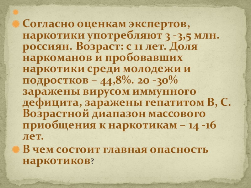 Согласно оценкам экспертов, наркотики употребляют 3 -3,5 млн. россиян. Возраст: с