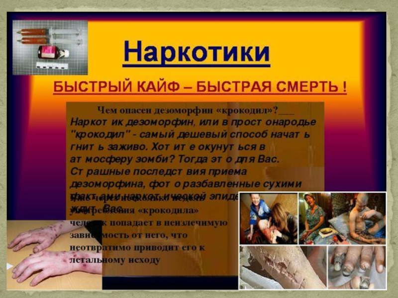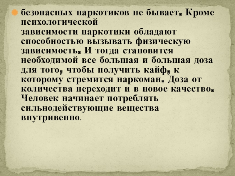 Слайд 25безопасных наркотиков не бывает. Кроме психологической зависимости наркотики обладают способностью вызывать физическую зависимость. И