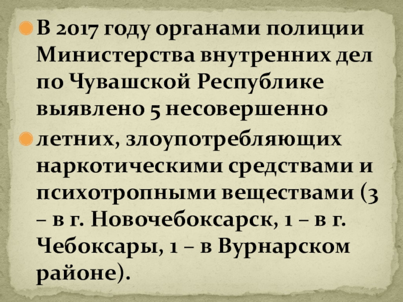 летних, злоупотребляющих наркотическими средствами и психотропными веществами (3 – в г. Новочебоксарск, 1 – в г. Чебоксары, 1 – в Вурнарском районе).