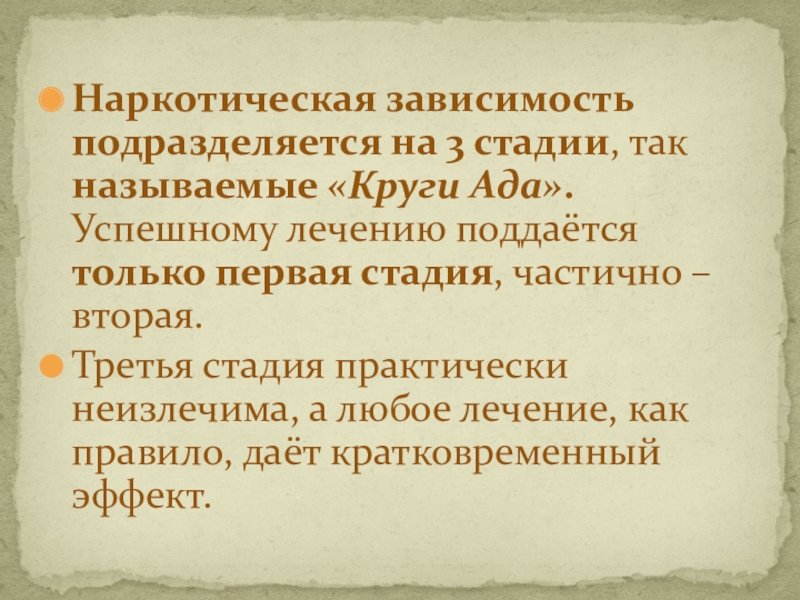 Слайд 39Наркотическая зависимость подразделяется на 3 стадии, так называемые «Круги Ада». Успешному лечению