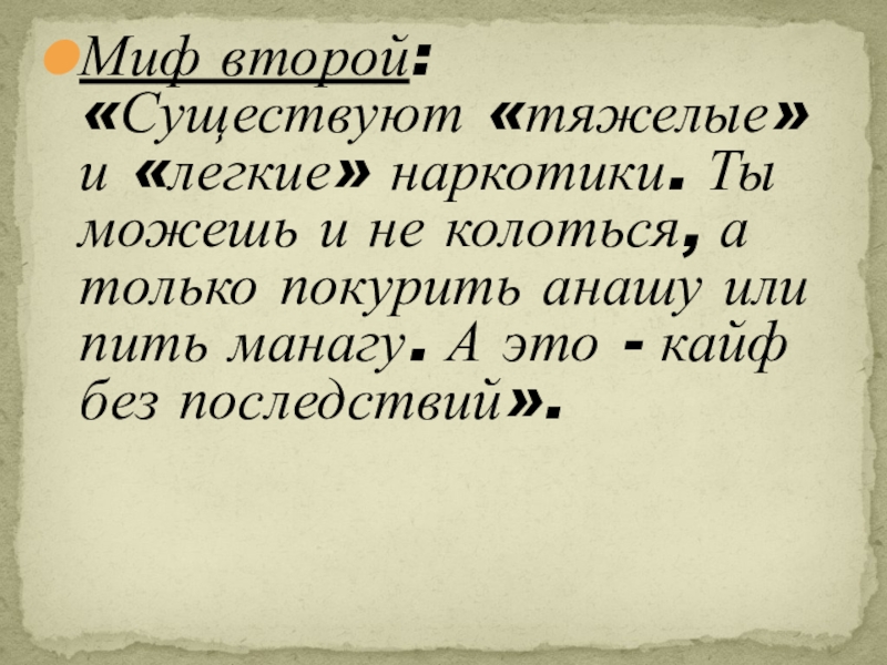 Слайд 24Миф второй: «Существуют «тяжелые» и «легкие» наркотики. Ты можешь и не колоться, а только покурить