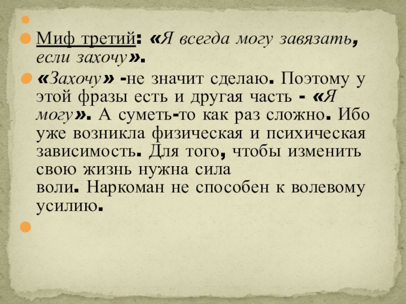 Слайд 27Миф четвертый: «наркотики дают возможность интеллектуального развития, проникновения тайны мироздания, в тайны