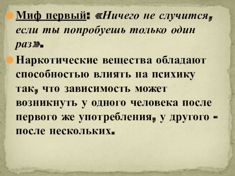 Слайд 23Миф первый: «Ничего не случится, если ты попробуешь только один раз».