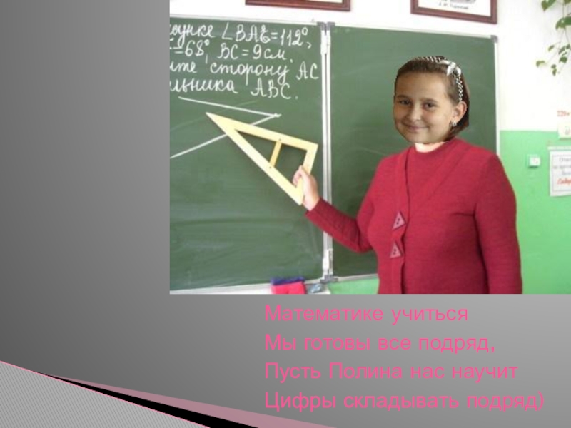 Математике учитьсяМы готовы все подряд,Пусть Полина нас научитЦифры складывать подряд)