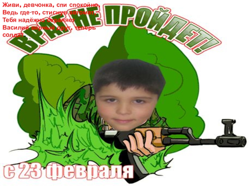 Слайд 4Живи, девчонка, спи спокойно, Ведь где-то, стиснув автомат, Тебя надёжно охраняет Василий верный друг,