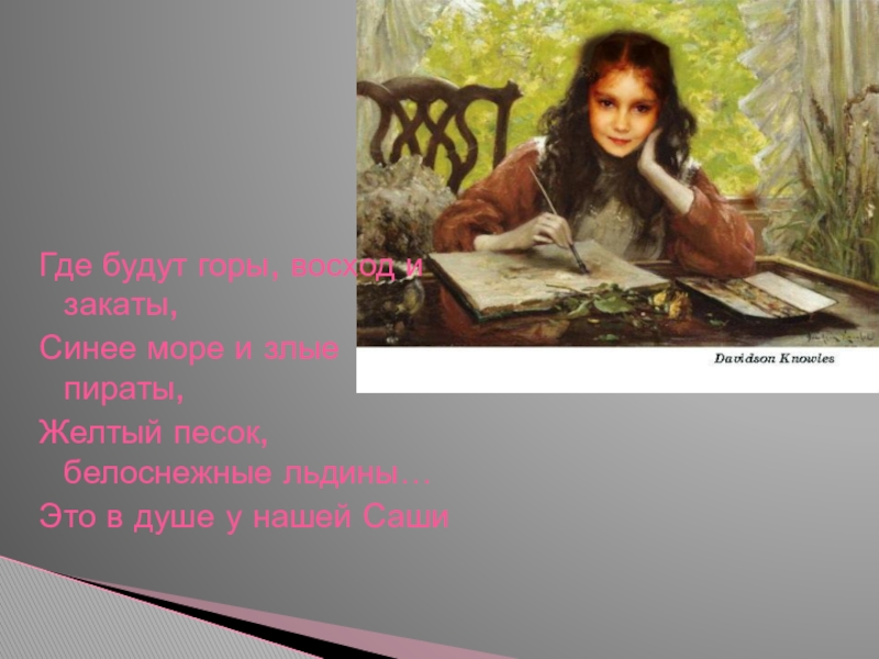 Где будут горы, восход и закаты,Синее море и злые пираты,Желтый песок, белоснежные льдины…Это в душе у нашей