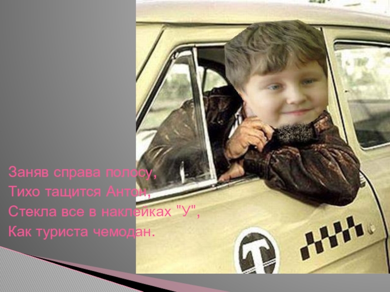 Заняв справа полосу,Тихо тащится Антон,Стекла все в наклейках
