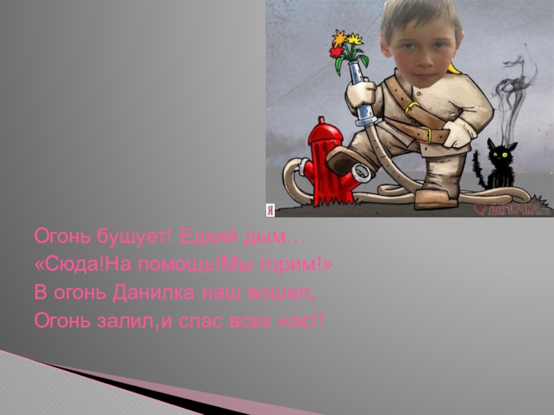 Огонь бушует! Едкий дым…«Сюда!На помощь!Мы горим!»В огонь Данилка наш вошел,Огонь залил,и спас всех нас!!
