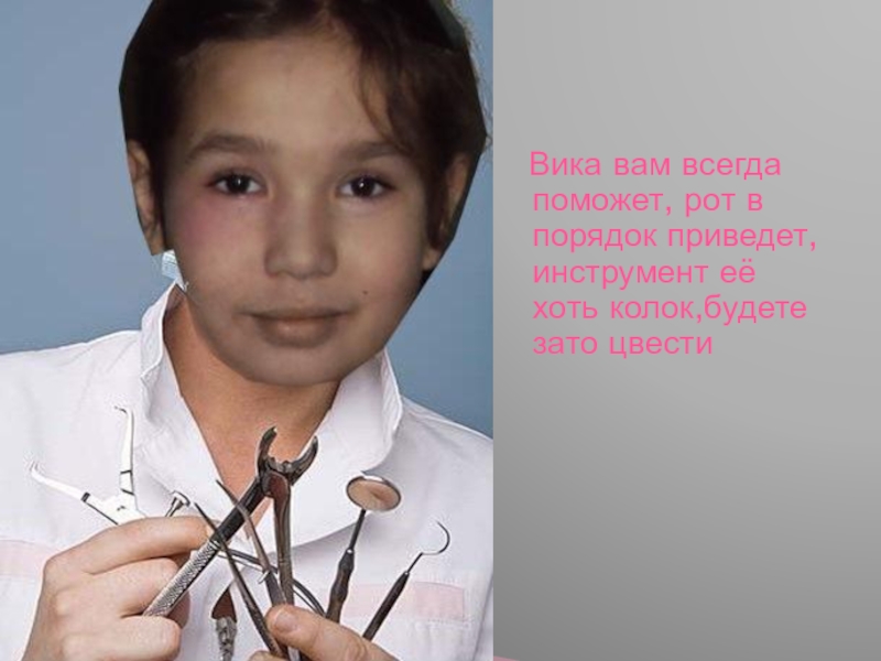 Слайд 19 Вика вам всегда поможет, рот в порядок приведет, инструмент её