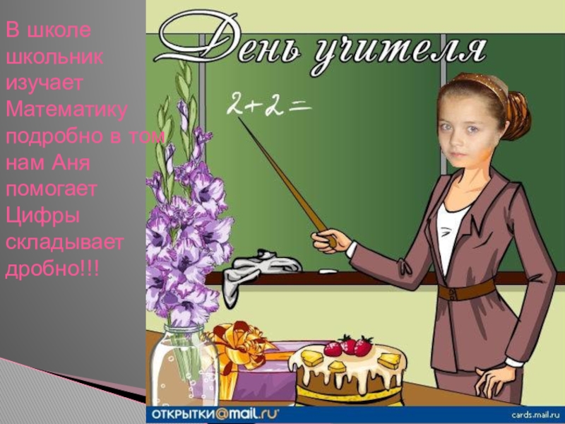 В школе школьник изучаетМатематику подробно в том нам Аня помогаетЦифры складывает дробно!!!