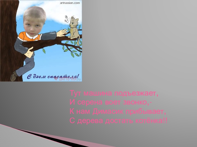 Тут машина подъезжает,И серена воет звонко,-К нам Димасик прибывает,С дерева достать котёнка!!