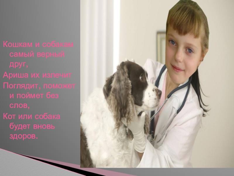 Кошкам и собакам самый верный друг,Ариша их излечитПоглядит, поможет и поймет без слов,Кот или собака будет вновь