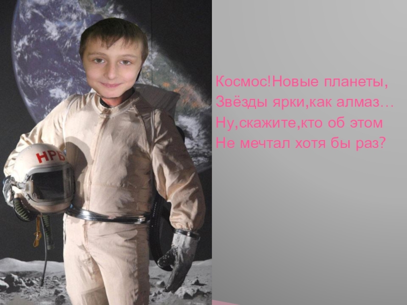 Космос!Новые планеты,Звёзды ярки,как алмаз…Ну,скажите,кто об этомНе мечтал хотя бы раз?