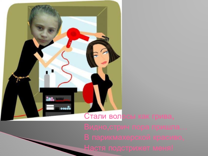 Стали волосы как грива,Видно,стрич пора пришла…В парикмахерской красиво,Настя подстрижет меня!