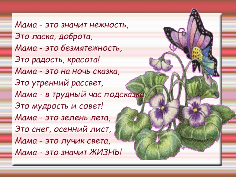 на ночь сказка, Это утренний рассвет, Мама - в трудный час подсказка, Это мудрость и совет! Мама - это зелень лета, Это снег, осенний лист, Мама - это лучик света, Мама - это значит ЖИЗНЬ!