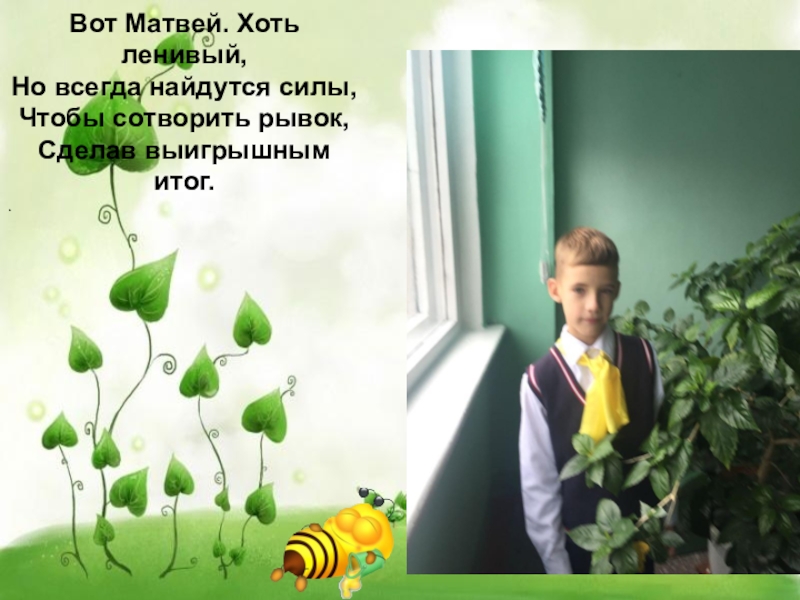 Вот Матвей. Хоть ленивый, Но всегда найдутся силы, Чтобы сотворить рывок, Сделав выигрышным итог..