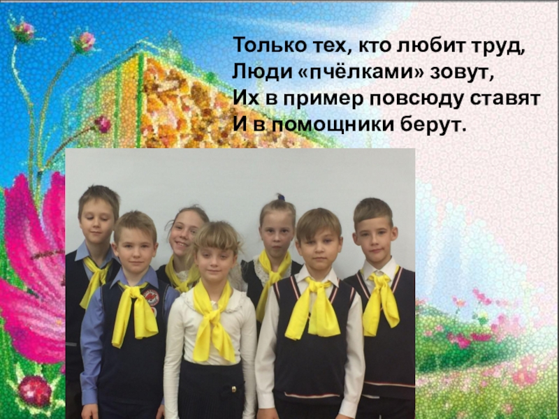Только тех, кто любит труд, Люди «пчёлками» зовут,Их в пример повсюду ставят И в помощники берут.
