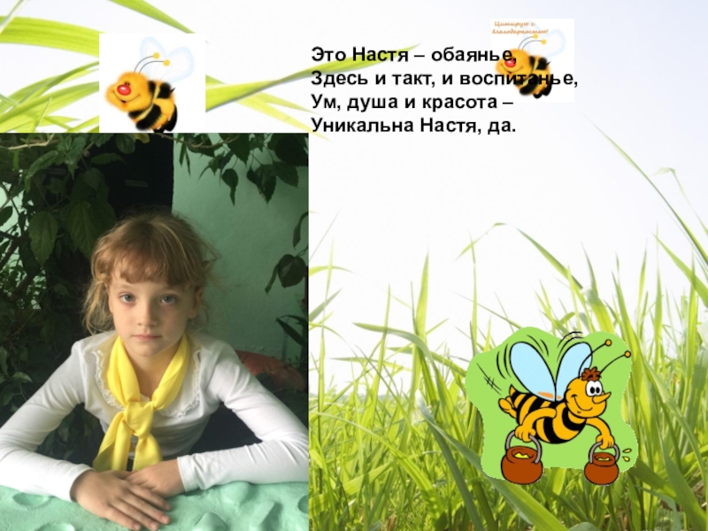 Это Настя – обаянье, Здесь и такт, и воспитанье, Ум, душа и красота – Уникальна Настя,