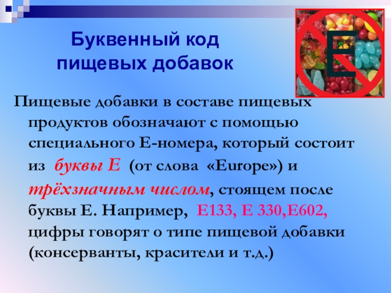 Пищевые добавки в составе пищевых продуктов обозначают с помощью специального Е-номера, который состоит из буквы Е (от слова «Europe») и трёхзначным числом, стоящем после буквы Е. Например, Е133, Е 330,Е602, цифры говорят о типе пищевой добавки (консерванты, красители и т.д.)
