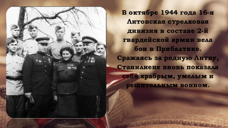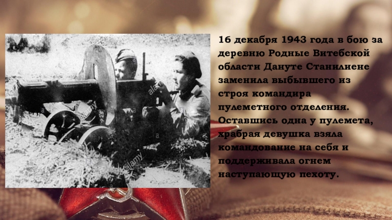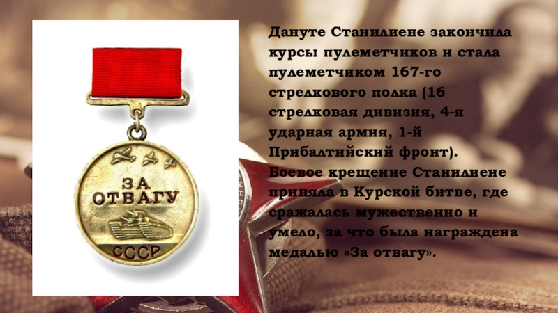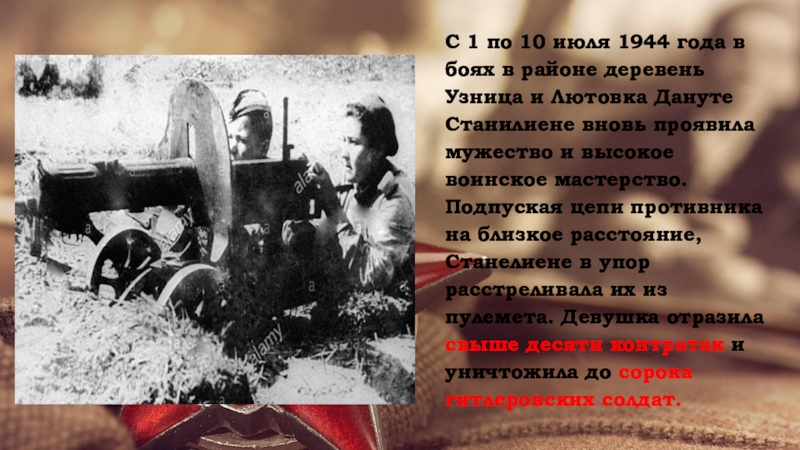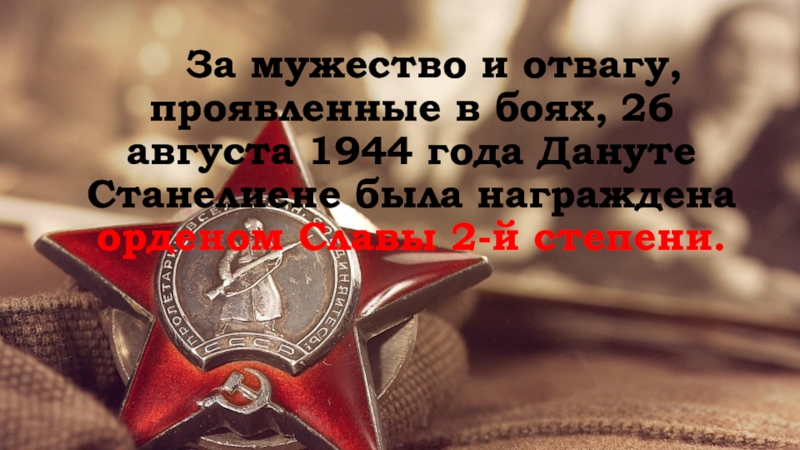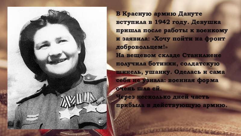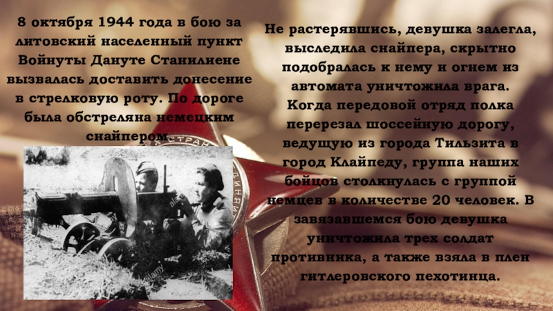 8 октября 1944 года в бою за литовский населенный пункт Войнуты Дануте Станилиене вызвалась доставить донесение в стрелковую роту. По дороге была обстреляна немецким снайпером.