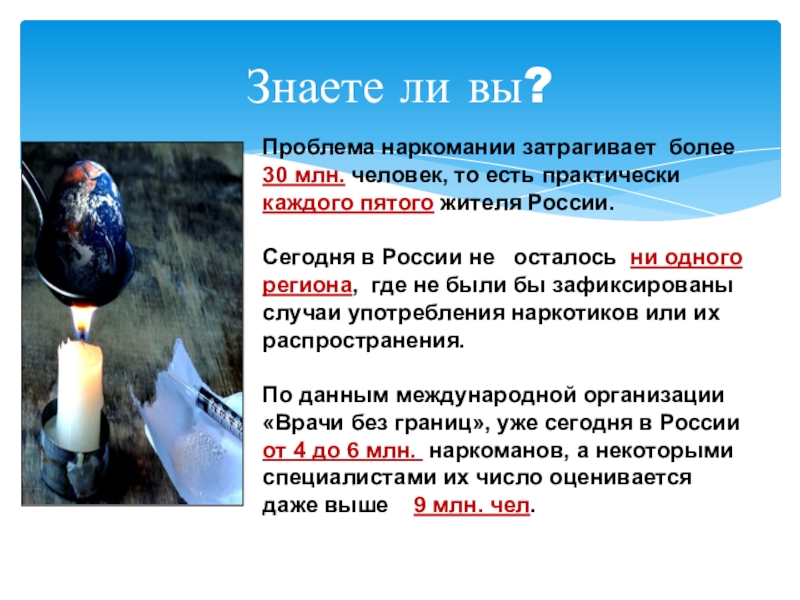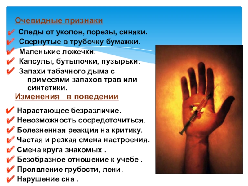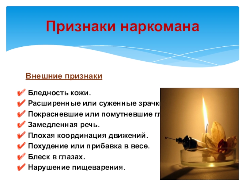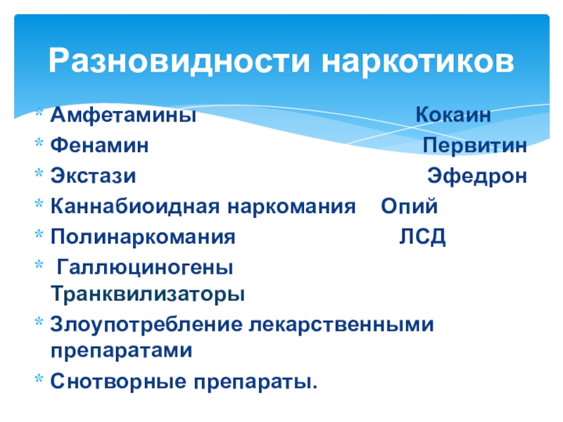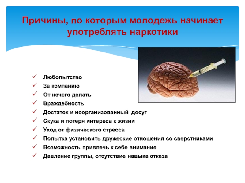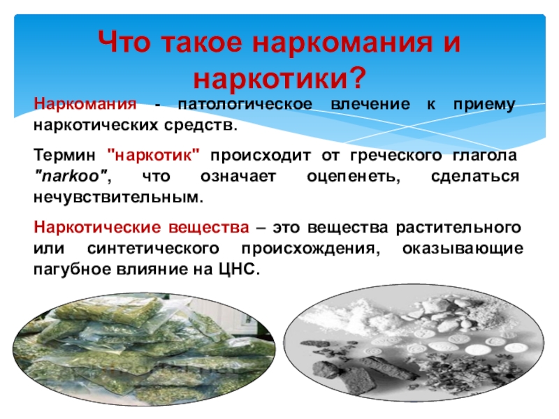 Наркотические вещества – это вещества растительного или синтетического происхождения, оказывающие пагубное влияние на ЦНС.