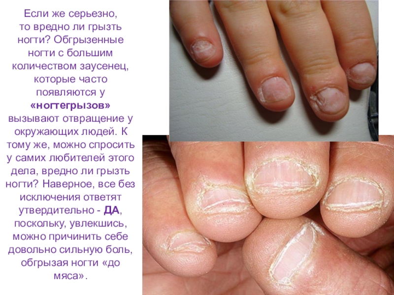 Если же серьезно, то вредно ли грызть ногти? Обгрызенные ногти с большим количеством заусенец, которые часто появляются у