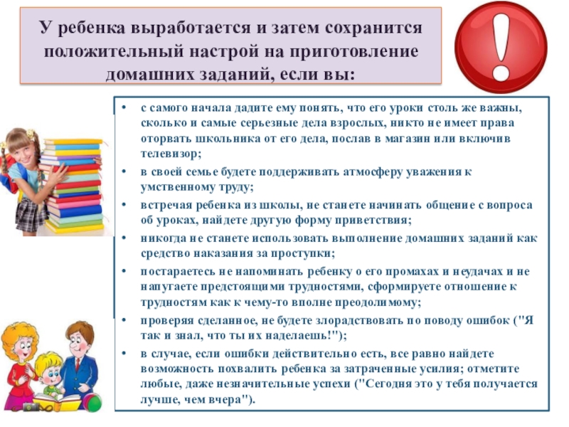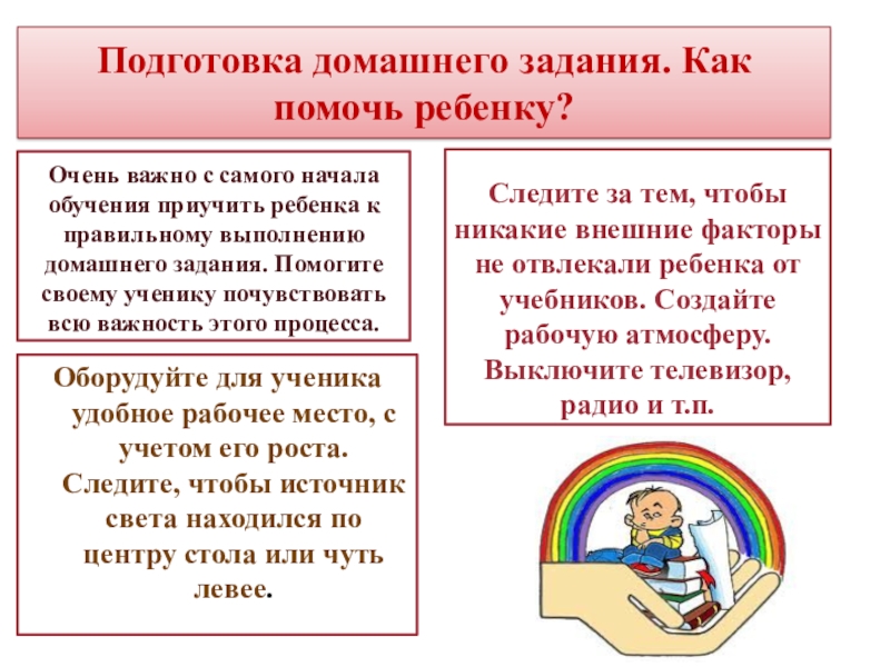 с самого начала дадите ему понять, что его уроки столь же важны, сколько и самые серьезные дела взрослых, никто не имеет права оторвать школьника от его дела, послав в магазин или включив телевизор;
