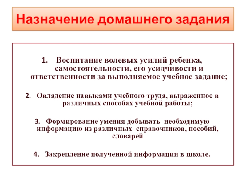 никогда не станете использовать выполнение домашних заданий как средство наказания за проступки;