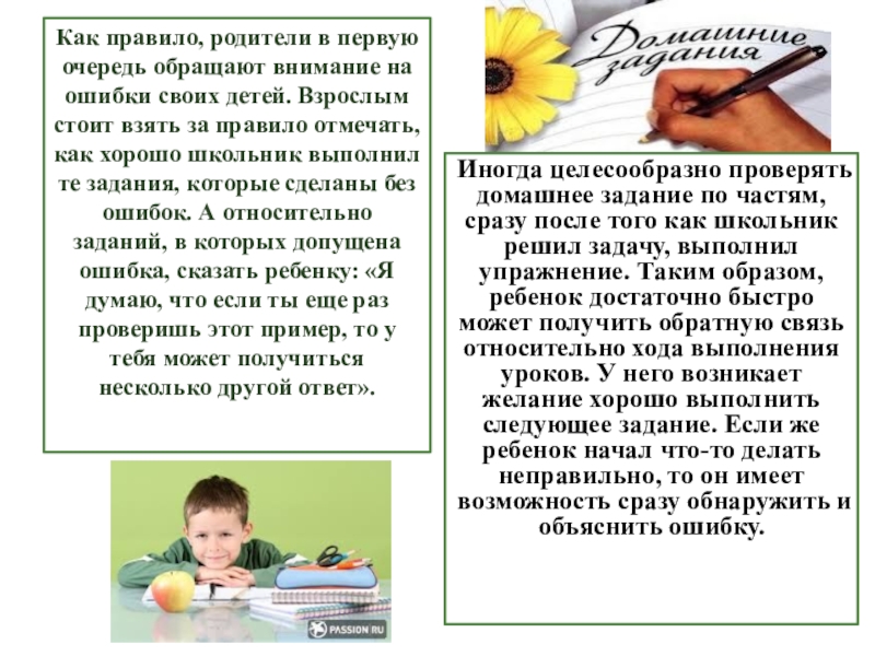 Иногда целесообразно проверять домашнее задание по частям, сразу после того как школьник решил задачу, выполнил упражнение. Таким образом, ребенок достаточно быстро может получить обратную связь относительно хода выполнения уроков. У него возникает желание хорошо выполнить следующее задание. Если же ребенок начал что-то делать неправильно, то он имеет возможность сразу обнаружить и объяснить ошибку.