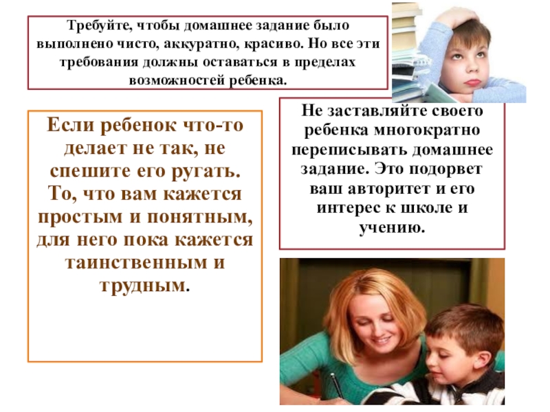 Не заставляйте своего ребенка многократно переписывать домашнее задание. Это подорвет ваш авторитет и его интерес к школе и учению.