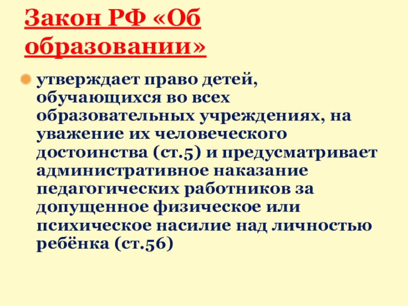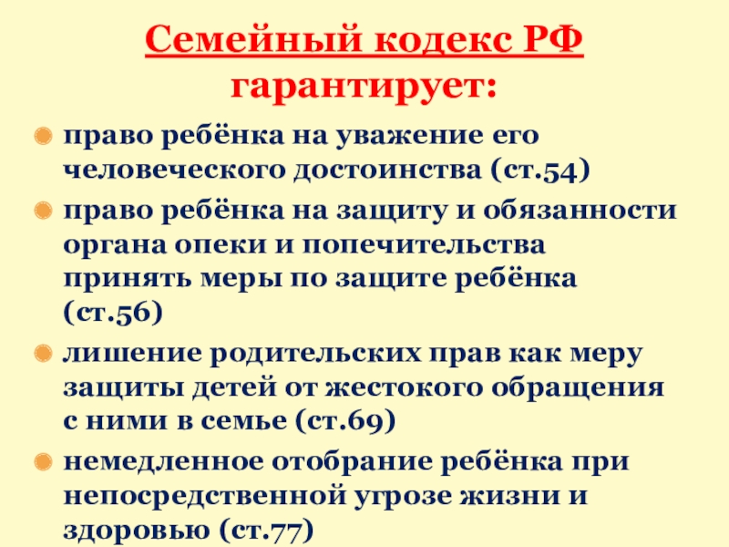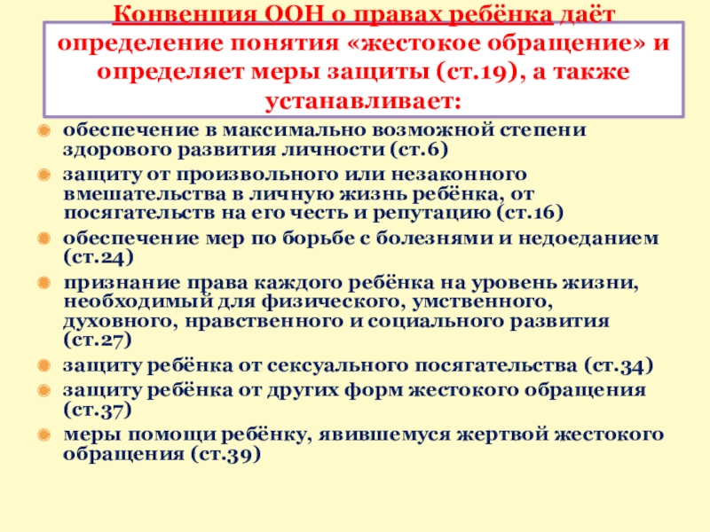 Конвенция ООН о правах ребёнка даёт определение понятия «жестокое обращение» и определяет меры защиты (ст.19), а также устанавливает:
