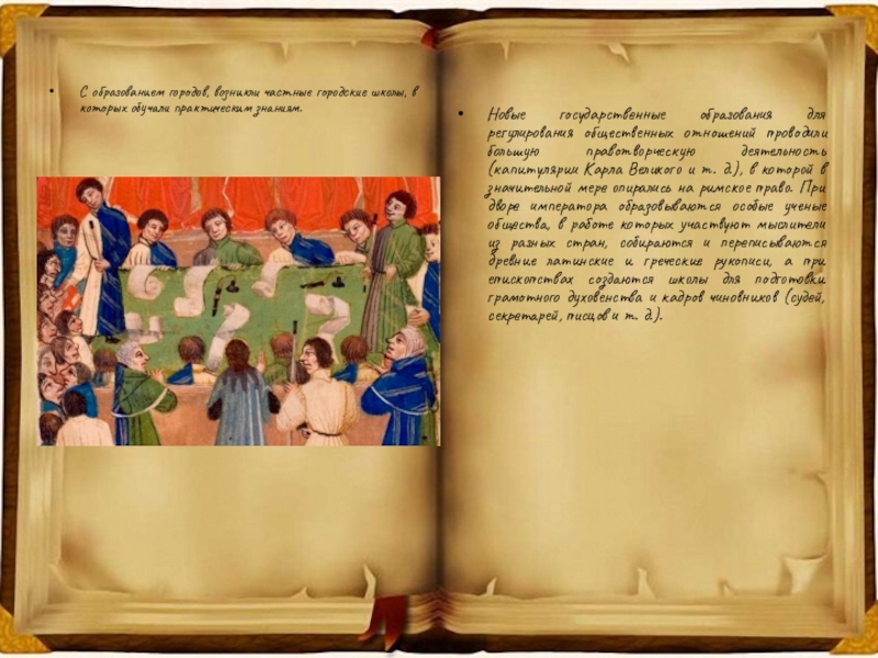 Новые государственные образования для регулирования общественных отношений проводили большую правотворческую деятельность (капитулярии Карла Великого и т. д.), в которой в значительной мере опирались на римское право. При дворе императора образовываются особые ученые общества, в работе которых участвуют мыслители из разных стран, собираются и переписываются древние латинские и греческие рукописи, а при епископствах создаются школы для подготовки грамотного духовенства и кадров чиновников (судей, секретарей, писцов и т. д.).