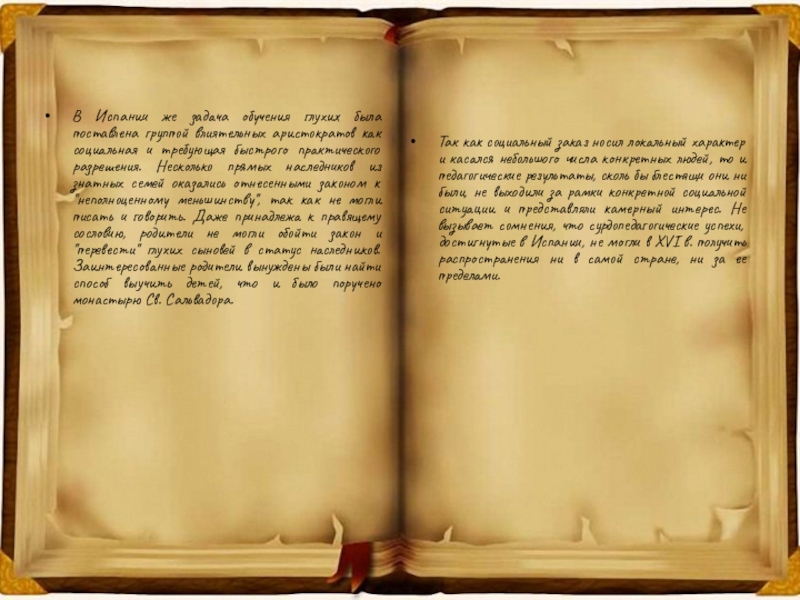 Так как социальный заказ носил локальный характер и касался небольшого числа конкретных людей, то и педагогические результаты, сколь бы блестящи они ни были, не выходили за рамки конкретной социальной ситуации и представляли камерный интерес. Не вызывает сомнения, что сурдопедагогические успехи, достигнутые в Испании, не могли в XVI в. получить распространения ни в самой стране, ни за ее пределами.