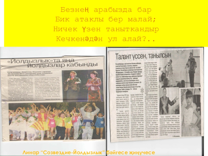 Безнең арабызда бар  Бик атаклы бер малай; Ничек үзен таныткандыр Кечкенәдән ул алай?..Линар “Созвездие-Йолдызлык” бәйгесе җиңүчесе