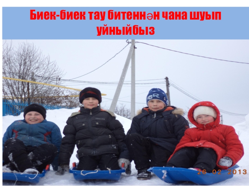 Слайд 21Биек-биек тау битеннән чана шуып уйныйбыз