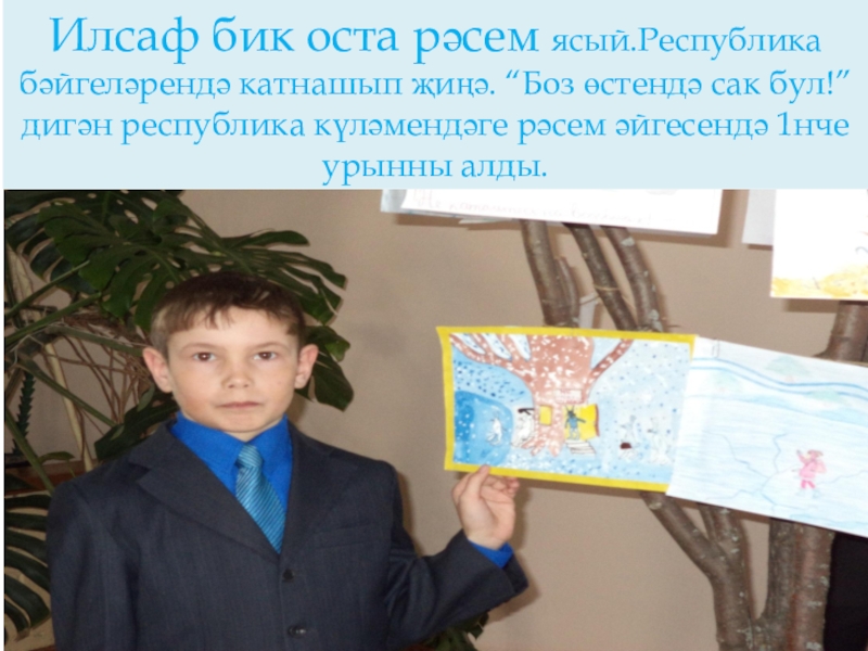 Слайд 18Илсаф бик оста рәсем ясый.Республика бәйгеләрендә катнашып җиңә. “Боз өстендә сак