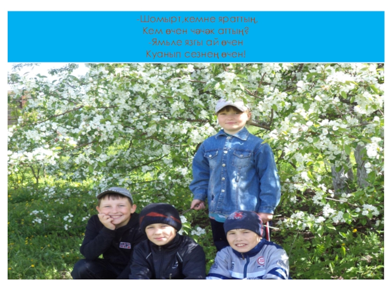 -Шомырт,кемне яраттың,Кем өчен чәчәк аттың?-Ямьле язгы ай өченКуанып сезнең өчен!