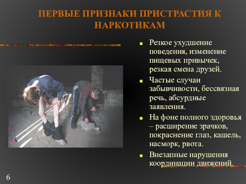 Слайд 6ПЕРВЫЕ ПРИЗНАКИ ПРИСТРАСТИЯ К НАРКОТИКАМ