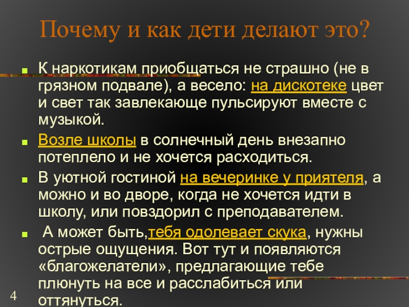 А может быть,тебя одолевает скука, нужны острые ощущения. Вот тут и появляются «благожелатели», предлагающие тебе плюнуть на все и расслабиться или оттянуться.