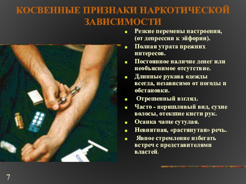 Слайд 7КОСВЕННЫЕ ПРИЗНАКИ НАРКОТИЧЕСКОЙ ЗАВИСИМОСТИ