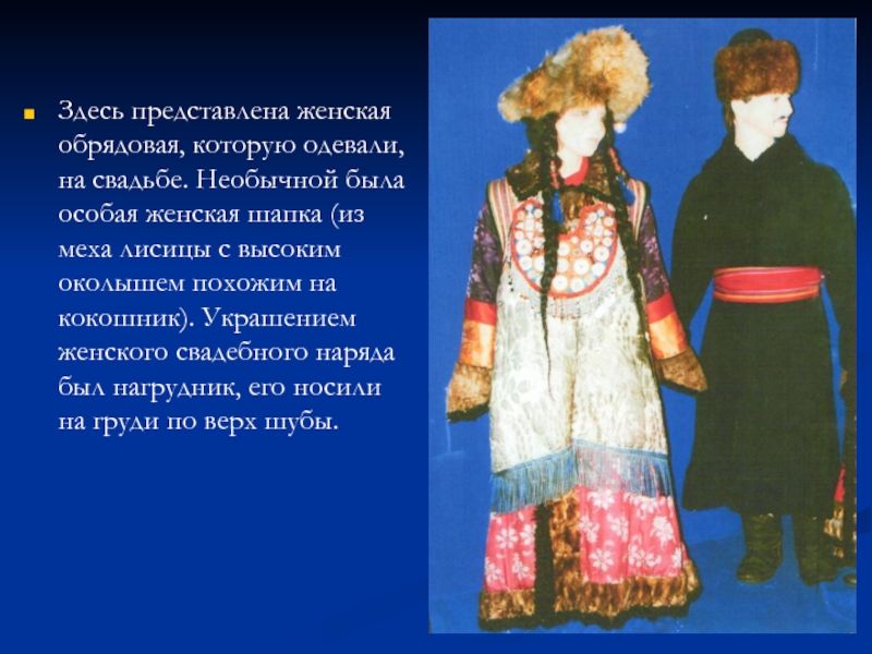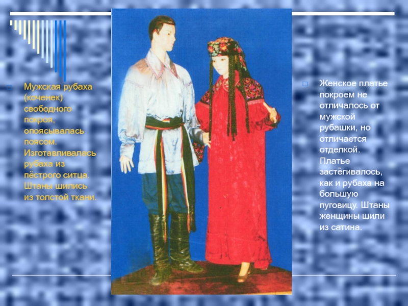 Женское платье покроем не отличалось от мужской рубашки, но отличается отделкой. Платье застёгивалось, как и рубаха на большую пуговицу. Штаны женщины шили из сатина.