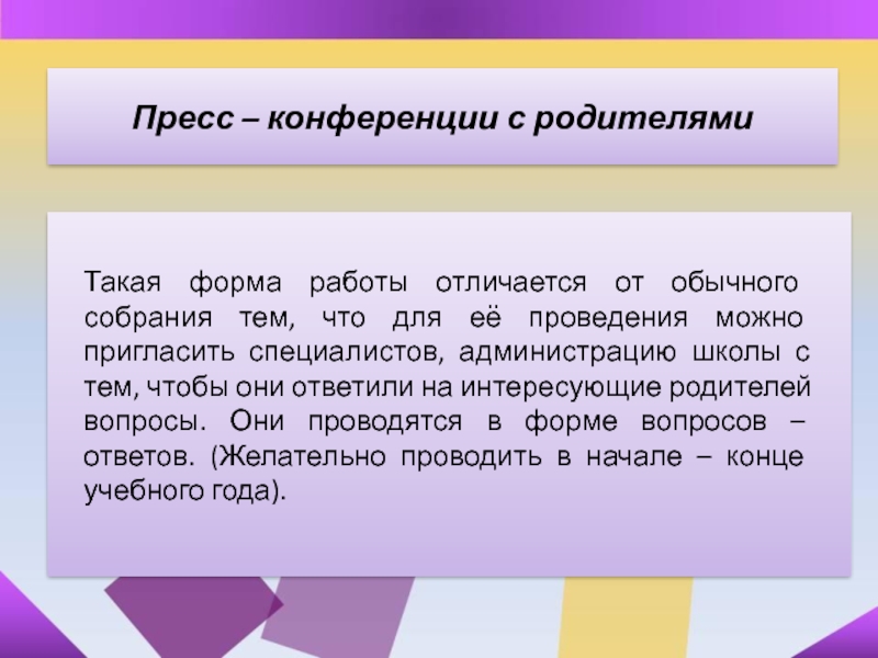 собрания тем, что для её проведения можно пригласить специалистов, администрацию школы с тем, чтобы они ответили на интересующие родителей вопросы. Они проводятся в форме вопросов – ответов. (Желательно проводить в начале – конце учебного года).