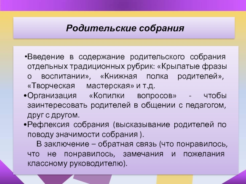 Введение в содержание родительского собрания отдельных традиционных рубрик: