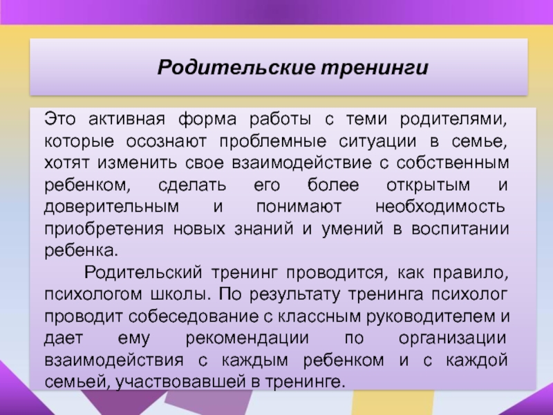 Родительский тренинг проводится, как правило, психологом школы. По результату тренинга психолог проводит собеседование с классным руководителем и дает ему рекомендации по организации взаимодействия с каждым ребенком и с каждой семьей, участвовавшей в тренинге.