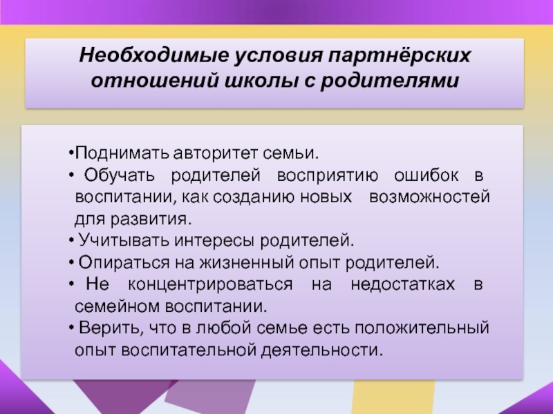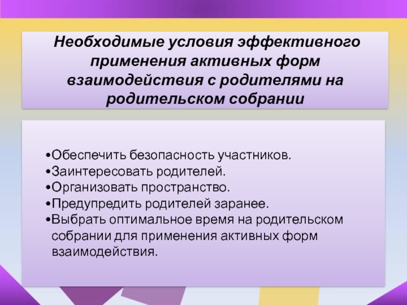 Необходимые условия эффективного применения активных форм взаимодействия с родителями на