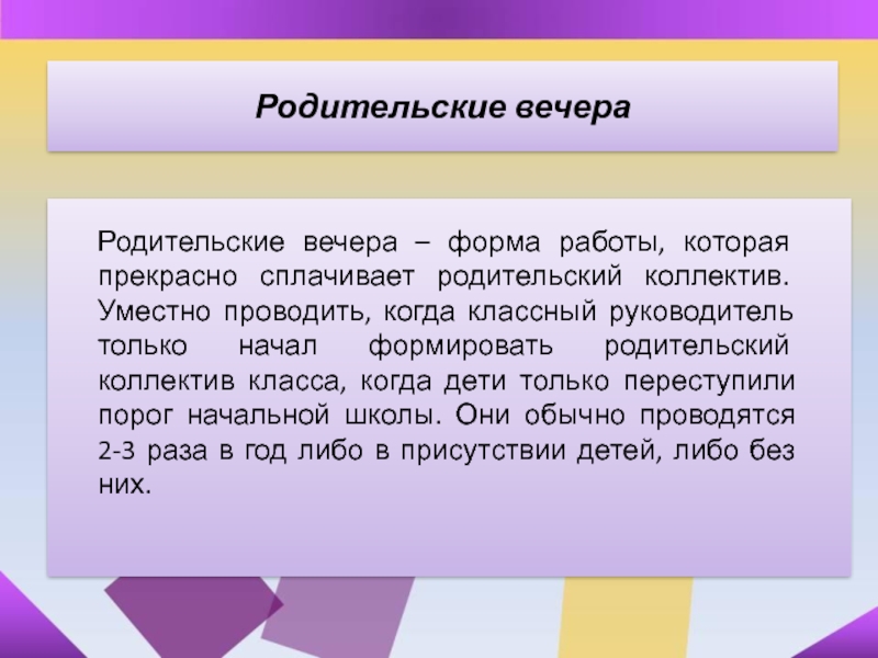 Родительские вечера – форма работы, которая прекрасно сплачивает родительский коллектив.