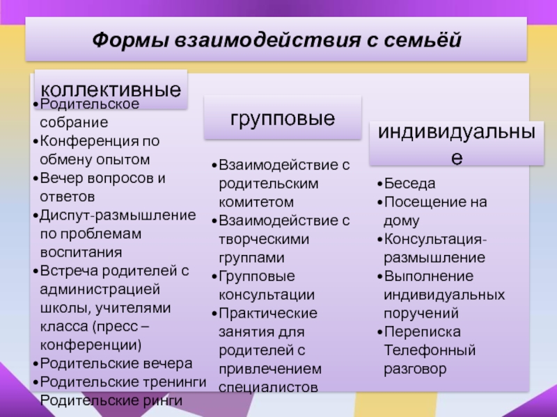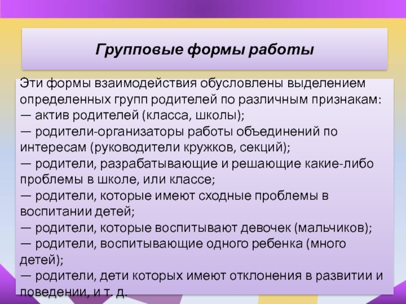 Эти формы взаимодействия обусловлены выделением определенных групп родителей
