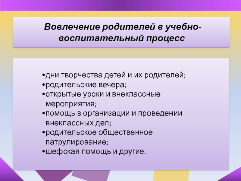 Слайд 7 Вовлечение родителей в учебно-воспитательный процесс