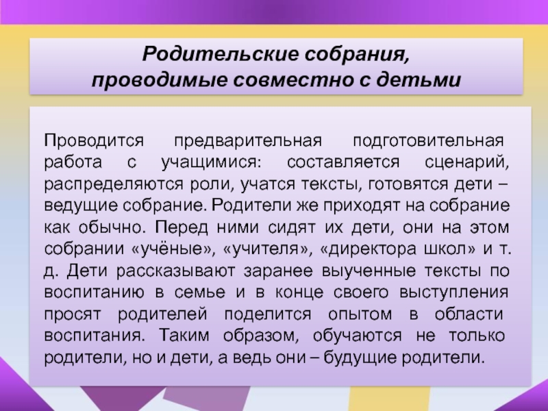составляется сценарий, распределяются роли, учатся тексты, готовятся дети – ведущие собрание. Родители же приходят на собрание как обычно. Перед ними сидят их дети, они на этом собрании «учёные», «учителя», «директора школ» и т.д. Дети рассказывают заранее выученные тексты по воспитанию в семье и в конце своего выступления просят родителей поделится опытом в области воспитания. Таким образом, обучаются не только родители, но и дети, а ведь они – будущие родители.
